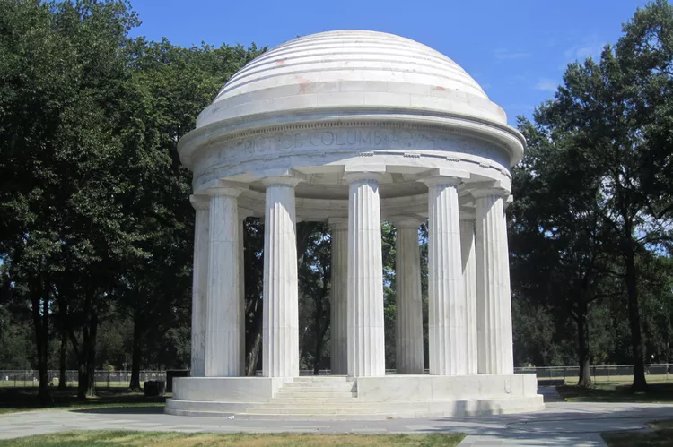The DC War Memorial, officially named the District of Columbia War Memorial, commemorates the 26,000 citizens of Washington, D.C., who served during World War I. The domed peristyle Doric temple, constructed of Vermont marble, uniquely stands as the only memorial on the National Mall dedicated to local residents. Inscribed at the memorial’s base are the 499 names of Washingtonians who lost their lives during World War I. It was dedicated by President Herbert Hoover in 1931 on Armistice Day, the day marking the official end of World War I.